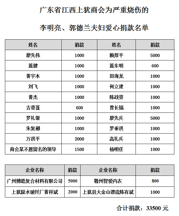 同時,廣東省江西上猶商會在得知此事后,會長劉易文指示秘書處組織、發起愛心捐款活動。上猶商會各理事會員積極響應捐款,短短幾天時間已籌集善款三萬多元。2014年6月10日下午,商會常務副會長賴厚平及商會秘書處組織副會長朱復郴、秘書孔凡順及博皓公司代表組成3人探訪團,親到廣州紅十字會醫院探望李明亮夫婦,并送上了這筆愛心捐款。副會長朱復郴慰問了患者并詳細詢問了其家屬情況,對其籌款近況提出了相應的建議,同時鼓勵李劍、李婷面對困難要堅強。李劍,李婷及其家屬對商會代表的到訪和愛心捐助表示衷心感謝!